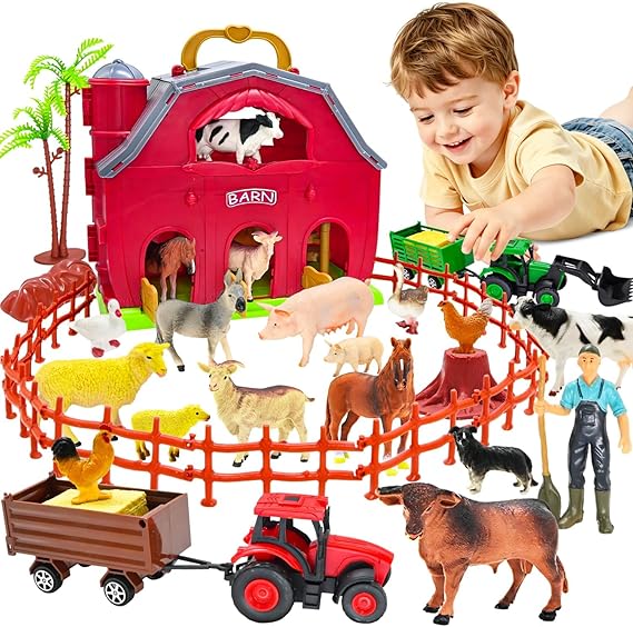 Listing details: 60-piece toy animal figurine set for kids; includes farm and jungle animals with a tree and fence backdrop; ideal for imaginative play and sensory activities.